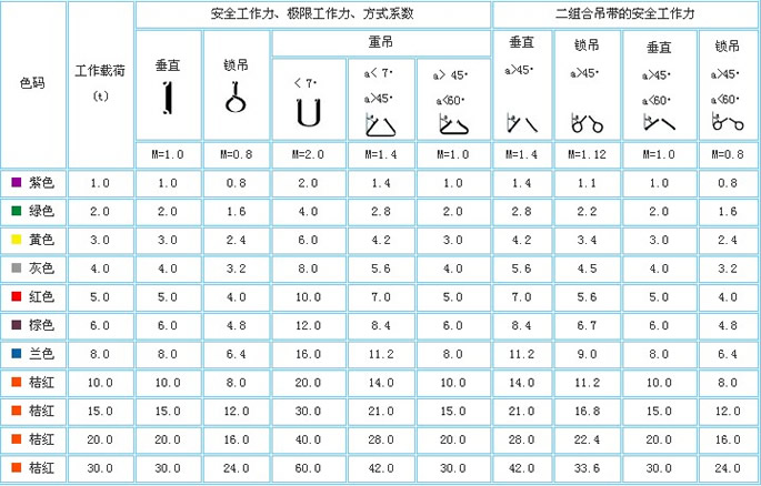 二、环形高强酸洗吊带的安全工作力、极限工作力、方式系数及色码
